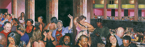 Poynton's painting records the profanation of this holy of holies, which was converted into apartments and sold off to the public a year or so ago. The orgiastic multi-racial party taking place in For Ever and Ever commemorates this conversion, and portrays the beneficiaries of the new dispensation celebrating their triumph over the old ideology and the repressive Calvinist morality it upheld.