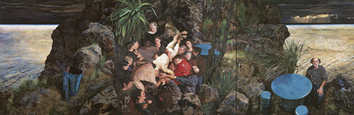 Betrayal takes place on a dream-like tropical island which distils the same sense of inscrutable mystery and infinite space as the seascapes of Caspar David Friedrich. The setting may be idyllic, but the action is nightmarish. Here a crowd, which includes yet another male nude, support and press in upon a naked, possibly dead, female, and react, in the main, with callous indifference or ghoulish delight. Although the nude woman is in no sense a portrait, Poynton admits that she identifies with this figure, and exploits her to express her fears of abandonment, persecution and defilement. The agent of the betrayal, the man seated at the table, portrays the same model as Poynton used in Surrender. In reality, this man is a close and admired friend so the painting is obviously an extremely intimate statement.
