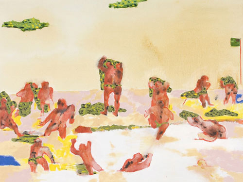 With this 2007 show, Hodgins characteristically balances his formal investigations into the properties of paint with an interest in the follies and endeavours of humankind. Some works, like The Battle of Cascina II, III and IV detour from the satire he is so fond of, back into the kind of territory he traversed in the 80's with seminal works like A Beast Slouches(1985). Taking their cue from this legendary battle from the pages of Italian history, Hodgins' images nonetheless become very direct comments on the absurdity of contemporary war and international aggression. This is borne out by more ambiguous works like Tourists in the wrong country and Welcome to our little black site. Initially puzzling, the latter turns out to be a reference to the US practice of transporting prisoners to so-called 'black sites' in Bulgaria in order to torture them, presumably in accordance with the demands of the 'war on terror'. As he so often does, Hodgins here explores the banality and awful humour inherent in such situations, his scratchy passages of paint grounding the scene very definitely in the abject. Across the space from this, a work titled Naked in Solitary provides the perfect counterpoint, an image of unexpected intimacy, a notion reinforced by its modest scale.