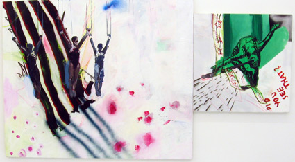 The show is designed to shift. From week to week the paintings rotate, some are completely removed to be replaced by new ones, while white spaces and blanks are introduced. The artist plans to leave only one painting for the final week. This shifting constellation of an 'insomniac's diary' is echoed by the paintings themselves: figures become lines, lines bleed into surfaces with traces of other versions of the same paintings still visible behind the paint. Text and direct tracings of popular icons in ink are applied over the painted surface. At times the painting marks resemble drawing, a preliminary process, threatened with erasure. In all, we are left with little to hold onto.