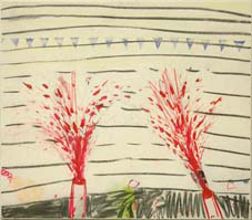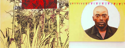 However, in a spectacular day, a gymnast is impaled on a pole; in I died a thousand times a lion and a tiger seem to be vomiting up an obsessively scribbled crayon blue. As such, the painting's palette of reds, yellows and purples shifts ambiguously between the light and playful and the difficult, even disturbing. The portrait of Congolese president Joseph Kabila, titled A good looking black man, commissioned from a signwriter, was initially coupled with the A good looking koppie. In both, a housepaint yellow predominates. In the circular portrait it forms a spotlight, a halo, even echoing the circular framing of a Medieval panel. For the koppie, it is the colour of highveld grass, but also yellow road markings, the Rastafarian and ANC flags, J&B billboards, and with a simple red band at the top of the painting: fire. For Rothko, these are the colours of hell. The 'virgins', however, accommodate both the associations of the potential collector and Rothko, in fact they are constantly playing off each other so that it is difficult to hold onto a single response. Imagery shifts, entire paintings are lost.