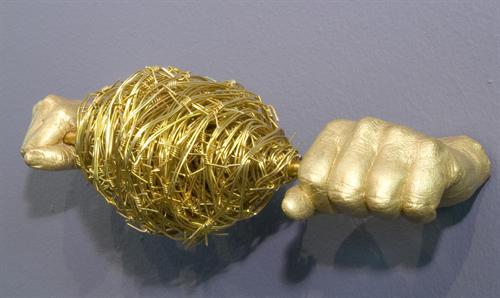 The prestigious Sasol Wax Art Award is aimed at established, professional artists who are required to use this material as part of their process, medium or concept for their works. The award for 2007 went to Walter Oltmann for a metal cast installation, using the lost wax method. Choosing to title his work Unearthing, Oltmann observes that this 'underpins the notion of uncovering or bringing to light by digging, searching or discovery. It reflects the post-Apartheid era impulse to uncover our history. The hands with dowsing tools suggest practices associated with finding water and settlements as much as digging and mining; as a means of survival, as well as exploiting the land for its riches and also denying access and agency to others.'