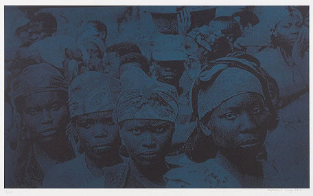 Alongside this, Moshekwa Langa's Untitled series of lithographs lined the back wall of the gallery and lent conceptual weight to the entire show. Very different from his drawings that we saw here last year, these lithographs are composed in dark, solemn tones that visually tie together the disparate sources from which he culls his imagery. The sombre hues also have another role, the blues, rusts and umbres that he employs lend the imagery a certain solemnity, pointing to the artist's critical distance from the images he displays. For me, all the images stayed anonymous and their sources unclear. Nonetheless a sense of recognition struck me through the series, perhaps because their disparate imagery puts the strange dynamics of South African media culture and society at large into focus. The images of rugby players with the famed Gilbert ball from a signed poster sit uncomfortably next to an image of a crowded group of women staring resignedly at the camera as it images their current plight. The unself-conscious rugby players intent on their game, a man whose eyes have been blinded by the collaging of another image of someone else's over his, the self-possession of the women confronting the alien lens, cumulatively showcase different levels of self-construction and presentation.