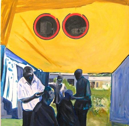 The head shots that appear in much of Shibase's work reflect, and are no doubt influenced by, the barber shop art that adorns so much of the city of Durban. And indeed one of the works,Economic Ascendance: A New Battleground, presents an interior of one of the portable barber-salons that populate the city's sidewalks. But the economic ascendance that takes place on the streets of Durban exists in a very different economic world from that in which the city's political and business leaders coalesce.