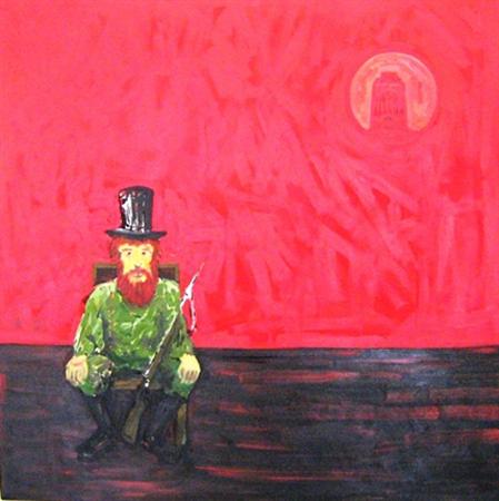 In Shibase's exploration of these masculine political archetypes, the figures he paints - who are often almost, but not quite recognisable - exist somewhere between the generic and the specific. In We are a Bruised People I & II, we see images reminiscent of Paul Kruger and Eugene de Kock, not in portrait mode but occupying small spaces on large canvases, presumably the canvas of a history broader than they are able to register. Elsewhere Shibase has produced more specifically recognisable portraits, such as Idi Amin. These issues of power, identity, history and masculinity are central to his fractured narrative.