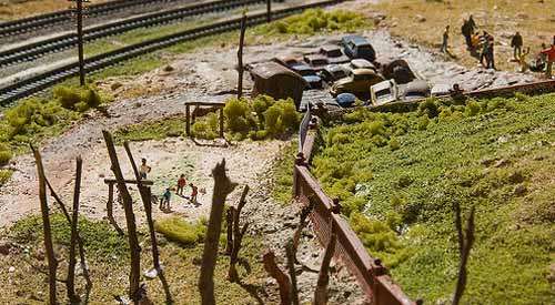 The work however refuses to be stuck as metaphor, and the investigation of the virtual becomes only one aspect of it, the rest being filled with a strange mix of the landscapes themselves and the personality traces of the characters who built them. Like all virtual worlds it is the content of them that strikes one, not the shell. In these intimate photographs of the small and intricate sets, a nostalgia is apparent. Due to our country's inescapable history a longing for the past inevitably takes on a political meaning, out of place in the hobbyists' enthusiasm but nevertheless prevalent.
