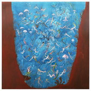 Play is also invoked in the erotic sense. Although they are not overtly sexual, the paintings seem to say something about the generative possibilities sex inspires, the primal joy of bodies touching, searching, witnessing one another. she shore shesaur she soar sees scaly water spirits relishing in a closed-loop massage train. In mother, moisture eyes her, a woman’s body melts into a pool between her legs, in which her bikini-clad friends swim, lounge, and play with each other and the waterblommetjies. abyssmistresses has something pleasantly masturbatory about it. As in, the sea-she-creatures seem to be exploring themselves in profound ways, navigating previously uncharted caverns of pleasure. For me, this is where Steyn’s work verges on the liberatory. Pushing femme representation away from dialectics of objectification and the gaze, Steyn enters into a world of women seducing and desiring and softening and deepening and luxuriating and enjoying themselves.