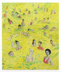 The paintings can be overwhelming, but not, I think, excessive. Steyn accomplishes this by treating each of her characters with care. below tide be low tied is filled corner to corner with figures – some above surface, some haunting the space beneath – yet none of them feel like fillers. They are whole, they have personality, they are protagonists in their own right. The two in the middle are having a sneaky underwater kiss; that one in the polo neck looks like she just got her heart broken; the one floating on her back is having her first quiet moment of the day.