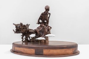 Upon viewing Wim Botha’s latest show at Stevenson, I thought about this story of my father’s. ‘The River’ is comprised of several wood sculptures, many of them skeletons or skeletal forms. The skeleton is a weird symbol. It symbolises death, but it does not necessarily make us think about death – the indisputable fact that we and our loved ones can at any point and will at some point – be ripped from this world. This is a lesson my father learned that day. Images of death cease to be mementoes and become the impetus for much terror and grief, perhaps best articulated by the sculpture Scenes from the River 8. Despair casts a shadow over its face; despair works away inside its chest, eroding.