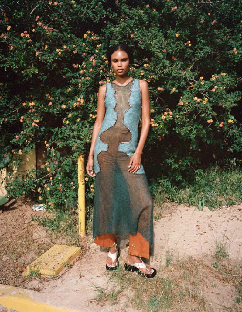 Tuana describes porosity of flesh as “[T]he hinge through which we are of and in the world.” In this instance, raw materials mediate the interaction of the commercial fashion label, Gaigher’s fine art practice and the applied knowledge of crafter Makaita Gobvu of the cowgirlblues team. “I knew cowgirlblues would be the perfect company to work with,” Mdingi says, “Mohair and silk marino wool would be the perfect raw materials to just bring that essence of Jeanne Gaigher as well as Lukhanyo Mdingi together.” In our conversation, Mdingi asserts, “The premise of our label is human beings more than anything else… I think there is something quite unparalleled with the human hands.” During the drafting process, Gaigher conjured a fictional set of a-symmetrical ribs curling down the centre of the body, which Gobvu then translated into a set of symmetrical lines with a hand-knitting machine. Gaigher discerns the differences between her lines and Gobvu’s machine as two different choreographies of the hand. I think of Gaigher’s hand choreography as also linguistic: the impossibility of a direct translation from one language to another.