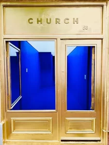 The blue interior of Church can be credited to artist Mbali Khoza’s current ‘intervention’ at Church, ‘Native of Nowhere’ (running until the end of August), which, for me, comprises the strongest component of her body of work in this space. Three text panels are hung from gold scrolls along the blue passage, each an excerpt from short stories by Nat Nakasa, Sisonke Msimang and Guilaine Kinounan, which respectively speak to alienation, xenophobia and self-exile. In her multi-part exhibition, including text, video, etching, neon lights and a ready-made painting, Khoza’s blue interior designates the ocean as a historical passage for loss, through which she mediates the “negotiation of black mobility over space and time” (paraphrase). Saidiya Hartman calls it “the middle passage” (2007) and references the small community of African Americans who have made settlements in Elmina, Ghana as “Middle Passage survivors” who “possessed no kin, clan or village home, all of the essential elements that defined belonging in the eyes of Ghanaians.” Likewise, the daughter of Oyeyemi’s novel must navigate her mother’s natal land as a stranger.