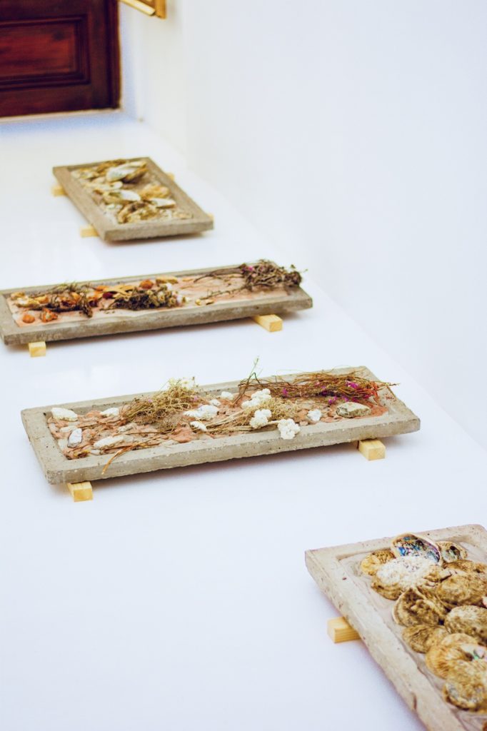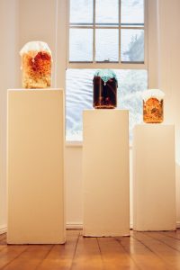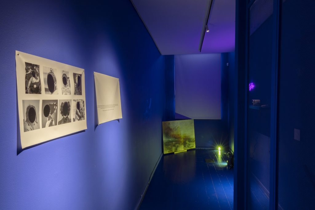 Church facilitates a passageway and, whether the artists invited to ‘intervene’ have consciously curated their work around it or not, the gallery’s narrow interiors facilitate a particular movement through its walls. One is either coming or going. A particularly sumptuous moment in ‘Litany for Survival’ was the meticulous presentation of ‘Paradise Pickles’, which comprised three large glass jars, filled to the brim with various food ingredients, including mussels, red onions and fennel seeds, swimming in white spirit vinegar. Brand credits ‘Paradise Pickles’ to family recipes for pickling, passed down generationally. This was a physical embodiment, a living memorial to preservation. In Oyeyemi’s Gingerbread, Perdita eats a batch of her mother’s gingerbread – a family recipe – before falling into a deep coma of metaphysical return to Druhastrana – her mother’s unknowable homeland. Brand’s placement of her living memorial sculptures at the light-box Black River bank are perhaps an invocation to return to a similarly unknowable place. Soudien muses on Brand’s photograph of the river bed, “Captured, too, is the promise of the river’s bounty and a silent longing for what was, and perhaps, what couldn’t be.” Perdita can only visit Druhastra in her dreams, meaning that she cannot be both in this place and awake at the same time. Perhaps Khoza’s passageway is also liminal space for dreaming: a ‘hydrocommons’ for longing.1In her book, Bodies of Water: Post Human Feminist Phenomenology (2017), Astrida Neimanis designates the ‘hydrocommons’ as a wet eco-system of water, constituted by the bodies through which it passes, including human, animal, insect, mycelial network, plant, ocean, sewerage system, cistern, river, puddle and reservoir. In Khoza’s blue passageway, I consider the ‘hydrocommons’ a wet negotiation of bodies-in-relation to a history of water. The irony being that water does not have a history per-say as it cycles and replenishes itself through living vessels ad-infinitum.