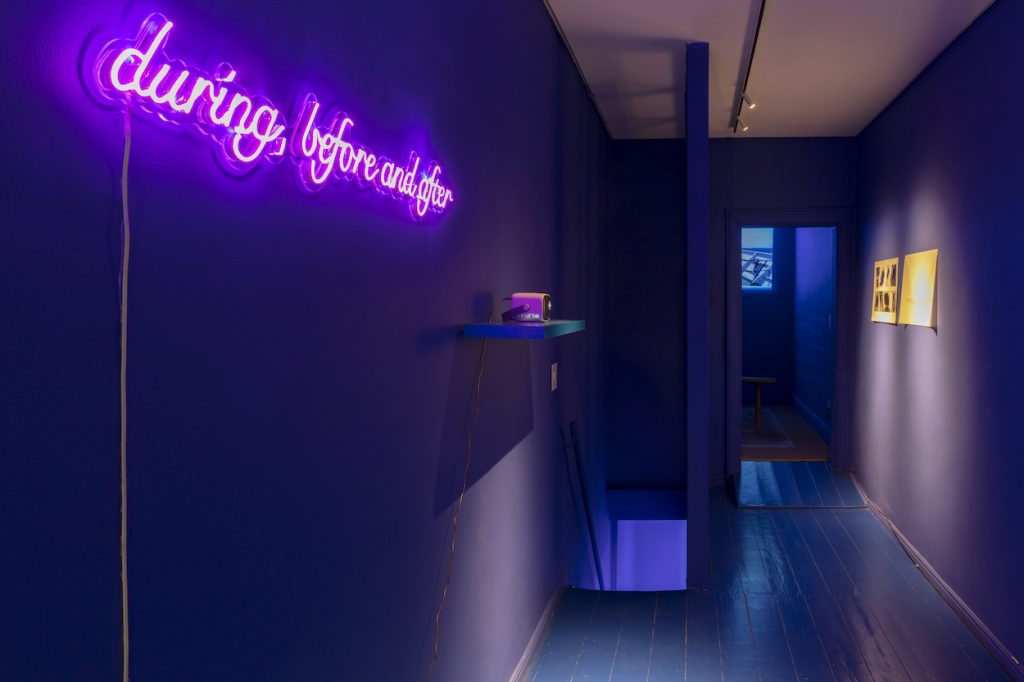 For her solo intervention at Church, ‘Litany for Survival’, some months prior to Khoza’s blue passage, artist Jody Brand invited passage dwellers to light a commemorative votive candle, each ceremoniously placed atop its own small gold pillar at the passage-ending exterior of a twin window. ‘Litany for Survival’ included sculpture, video and photographic images, each an expression of mourning for Brand’s family’s historical displacement from Black River (a suburb in Rondebosch, Cape Town). In 1966, Black River was declared a ‘white’ area under the Apartheid government’s Native Land Act, actioning an edict for the forced removal of people classified as ‘coloured’ from their homes. Brand’s banner-sized photograph of the verdant river bank of Black River was exhibited over the top-story windows to Church. Viewed from the street, the photograph appeared a solid print and, when viewed from inside of the gallery during day-time opening hours, it appeared to be back-lit – a wonderfully imaginative use of the sun as a light-box mechanism. Reflecting on a history of displacement and subsequent longing for home in a post-Apartheid South Africa, Hartman’s Middle Passage might also be assigned to a waterless displacement of bodies from land over time. Writer Amy Soudien opens her essay on ‘Litany for Survival’ with the integral question of Brand’s intervention: “Where do we find a place to mourn, to heal?”
