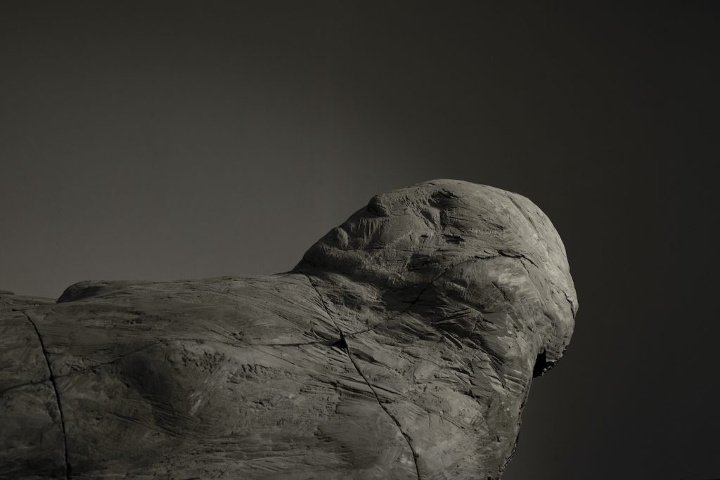 Modernity’s unease with the physical body saw not only the Cartesian divide of spirit, mind and body but also categorised women’s bodies as animal, uncontrolled or insane. Moe’s large figure is serene, unapologetically full and forceful. While recognisably female, this body is not concerned with narratives of beauty. This figure is not the sensual nude of western art history but something ancient that came before modern women were dispossessed of a connection with their bodies. The head is the high point of the sculpture and is held up by the strong curve of the back, shoulders and neck. While lying down, this figure is not reclining or passive. Moe’s work speaks an older language of stone implements and a culture where women were worshipped for their ability to reproduce. In other words, the sculpture alludes to a time when bodies were valued for what they could do, rather than aesthetics.