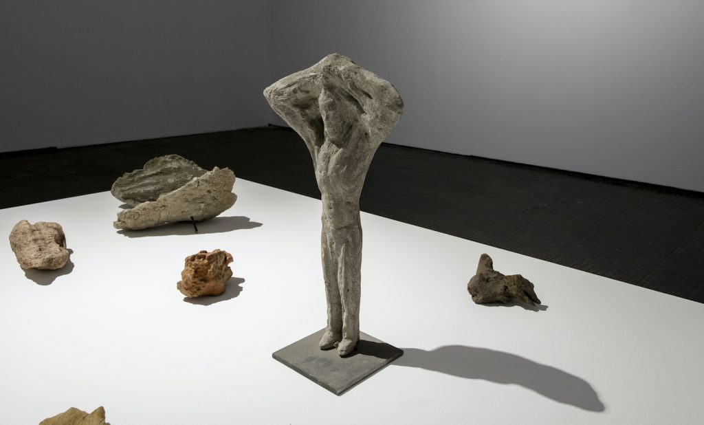 In contrast to the drawings, the lack of limbs and movement in the sculptures forces the viewer to concentrate on the possibilities of solidity. With the largest sculpture, it is intriguing to encounter the female form as monolithic and unmoving. The large sculpture rests alone in the room, while those in the next-door room exist in community. Some of these smaller sculptures are embedded with stones and evoke the idea of forms that are born and not made, as is prized in the tradition of Zen pottery. This quality emphasizes the timeless quality of the forms. Like ceramic, concrete is similarly a material of the ancient world. But unlike clay that requires firing, the sculptures on display are cured by contact with air. This fact is cause for thought. The simple act of breathing solidifies our presence, our material existence and ultimately our demise. And yet, unlike us, concrete continues to get harder as time passes.