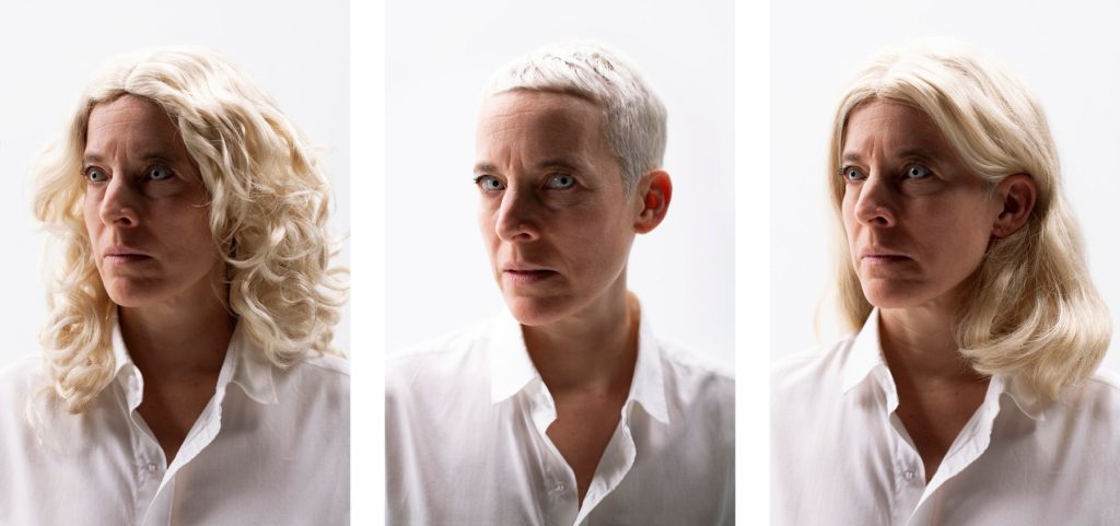 “White people talking about race! White people talking about race!” Repeat. I have had this little refrain stuck in my head ever since attending the opening of Candice Breitz’s Whiteface at Goodman Gallery in Cape Town. The line was recited to a catchy rhythm in the middle of the titular video installation, which was also the main attraction of the show. Across two channels, the artist cut together snippets of online content that involved white people talking about race. An edit of the found footage played on a small monitor at the back of the screening room and the accompanying sound served as material for Breitz’s satirical performance film. On a much larger screen, at the other end of the auditorium, the artist lip synced along to the supercut of race takes wearing an array of blonde wigs and zombie contact lenses. The video was edited effectively, with comedic timing and a mantric rhythm in mind, but the “white people talking about race!” interlude was especially snappy, like a welcome musical number in the middle of an otherwise colourless movie.