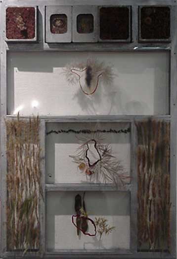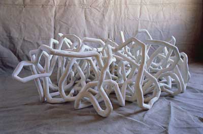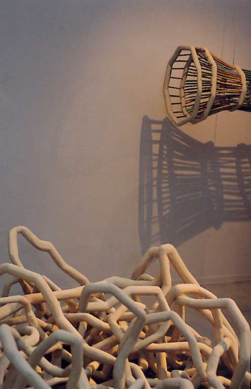 by Sue Williamson Entitled 'A Natural Language', the current show at João Ferreira Fine Art marks the first showing in Cape Town of the young artist Justin Anschutz, following two shows in earlier years in Johannesburg at the Karen McKerron Gallery. Anschutz uses organic materials, wood, cloth, sand, and through a process of intense labour, transforms these into art pieces which have a strong link not only to forms found in the natural world but to archetypical images buried in the subconscious. Cutting wood in the forest, stripping it, whittling each piece and connecting it to hundreds of other pieces, Anschutz comes up with the visually satisfying Sway, a wild but ordered tangle of twisting tubular forms which seems to speak both of the body and of mass of writhing roots, or even, perhaps, of a concrete expression of the invisible connections and conjunctions that link man inexorably to nature . Viewers can be seen carefully examining the tangle to see if there is a point where the piece begins or ends. And then there is the moving and dreamlike Flash Fin, a coffin shaped, boat-like shallow basket, filled with a cargo of tightly packed oval forms. Stained with subtle pigments and fabricated from laminated corrugated cardboard, these have the appearance of river-smoothed stones, but suggest, perhaps, the loads and burdens we must carry through life. Formally powerful, the piece evokes all manner of associations. Fish Trap, unexpectedly jutting out of the wall above the heads of viewers, is Anschutz's version of the time-old device used by riverside dwellers to catch their daily food. A series of nine panels of old wooden floor blocks, laminated, freely carved into, and stained allows a variety of permutations of arrangement, according to the space available - a rare freedom in the art world. Perhaps the least successful of the works is one of the large rectangular panels, overlaid with a tracery of thin clothbound branches, in which the underlying marks and carvings seem somewhat arbitrary and forced. But overall, the deep feeling that Anschutz has for the natural world clearly and surely dictates his hand and his eye. The artist has a remarkable ability for making his pieces look as if, for all their pleasing roughness, they have to be that way and no other - the distinguishing characteristic of good art. Until March 25 João Ferreira Fine Art. 80 Hout Street