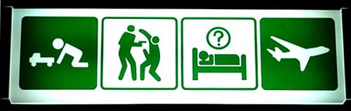 Lisa Brice's 'Work in Transit' and Hentie van der Merwe's 'Trappings' at the Goodman by Kathryn Smith Often when shows are much-anticipated (as this one was for me), the reaction when eventually faced with the work is "Oh...umm...okay," simply because we've built up an image in our minds of what we would like to see. Not so with this show. While Brice's work seems deceptively simple, it is precisely this apparent ease of execution and simplicity of concept that keeps on recurring and unravelling to reveal deep complexities and a sharp and sardonic sense of humour. Although visually worlds apart, Van der Merwe's body of large photographs of military uniforms shot at the Museum of Military History, Johannesburg, are really quite close to Brice's work in their affect. He has managed, as only a skilled and mature thinker can, to marry form and content in a way that reduces complexities to their essences, and renders exquisite everything that is 'un-beautiful' and violent. Van der Merwe's work is flanked by Brice's, and as such, one's experience of the exhibition is that of two distinct and separate shows. Only when you begin walking between the two, do you realise that what these two artists are dealing with is really quite similar in impetus. Violence, identity, geographies of experience and the trappings of culture and vice come under the spotlight here, and apparently rather serendipitously too. Neither artist had any real idea what the other was planning to show. A sense of transient, fleeting experience emerges - something that is within your reach, but that you cannot grasp with any sense of surety or permanence. In Score: Signals and Score: Logo's, Brice gives us the icons and codes of a fickle and dangerous gangland subculture. While these imply the desperate affiliations of drug runners and gang underdogs trying to ascend the ranks in their fraught hierarchies, the opposite end of the scale is true too. The brand association brings to mind those who end up buying their product: high-end consumers with money to burn and where sportswear, while being an aspect of identity, is really just a choice about what to wear to the Health and Racquet Club. It is usually these same people who are the subjects of her Exit Sign series, exceedingly clever reworkings of standardised codes understood on a global scale. They give visual representation to (often but not exclusively) white South African 'fright-fight-flight' anxieties. Photographic records of the signs in situ provoke a reassessing, or at least a consciousness, of what these signs can actually imply. Brice' work is 'transient' in its implications and subject matter, augmented by the fact that her process was affected by a heavy travelling schedule. On the other hand, Van der Merwe gives us transient images of an experience that stays with you forever - that of war. And the images stay with you too, although - or perhaps because they are - impenetrable and out of focus. It's hard to say anything about these images as whatever one says immediately becomes a contradiction. I think this is because they are truly experiential things. On an intellectual level, one can appreciate their eloquence in deconstructing the trappings of war. The death-machine that is war is 'window-dressed' to appear heroic and morally admirable. Van der Merwe tackles this male violence (both subtle and overt) head-on - decorations become blurry, nondescript shapes. Red velvet trimming morphs into open wounds. And they are printed up to a scale that makes these amorphous corpses of history genuinely spooky. At the same time however, they are glowing fields of intense, abstract colour, and incredibly powerful when presented together in a space. Brice and Van der Merwe are undoubtedly important figures on the South African art scene. This show should solidify this fact for some, and seduce others into following their careers quite closely. Ends March 25
