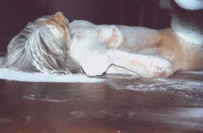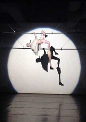 by Kathryn Smith From a well-informed Wits Theatre mole, we discovered that audiences of this second showing of the performance art programme were mercifully spared the more 'substandard' entries. Whether or not this was due only to bad work, or complaints about a very protracted first showing (Tuesday's events went on for some four hours) is unclear. But those pieces that made it into 'round two' as it were, were interesting and entertaining, if nothing else. Comprising mainly performance art, more traditional dance did manage to squeeze a satin-clad foot in the door, but only just. And how strange it looked, wedged between Elu's gracelessly elegant The Goatfoot God - Pan: Part 1: Beaten Stag and The Goatfoot God - Pan: Part 2: Fetish Dance (performed to Panpipes of the Andes and Marilyn Manson's Eurythmics cover Sweet Dreams respectively); and Steven Cohen's Limping into the African Renaissance, a complex piece combining his Taste work with prosthetic leg-acrobatics. Craig Morris' study of nervous, almost autistic communication between two people in Haven't We Met?, and Pinto Ferreira's Reconstructing@Babel.com deserve a mention, as does Athena Mazarakis's outstanding dance/vocal performance in her own My Back to the Bells. But it was Bevan Cullinan's punctuation of the stage changeovers (culminating in his powerful and tragic Love, Marriage and the Moon) that provided excellent comic relief to the evening's rather angstvol proceedings. Broom in hand, he frenetically swept and loped across the stage, until he spotted a hapless audience member. Throughout the three short prologues to the main piece, he presented her with all manner of floral offerings while grotesquely mouthing 'I Love You' at the appropriate moments in the saccharine Francoise Hardy track, "Find Me a Boy". Broadly speaking, technophobia, misguided technophilia, and dysfunctional bodies and relationships emerged as thematic constants. Boundaries between performance, cinematics and video, and the visual arts are ever-receding as choreographers used video and slide projection quite effectively. And not surprisingly, it was Cohen and Elu who emerged as the most successful in this regard, in that the accompanying video referred out to a 'lived' context beyond the confines of the constructed stage. Elu is depicted horned and naked in a field of cows, being herded off with the pack, and making his way down a busy urban street in fetish pointe shoes, shirt, tie and briefcase. Cohen struggles along a rural dirt road in prosthetic leg and virginal white froth, accompanied by a female traditional healer. Dragging the extra appendage gets the better of him and he eventually succumbs to the ground. His soundtrack included excerpts from radio interviews and messages recorded onto his answering machine, and Cohen himself answering the question, "What is performance art?" This ran the risk of being didactic, but in the context of his fraught relationship with the sponsors and resistant public, it did more to set the record straight and provide a point of access, than damage his artistic integrity. Elu and Cohen have forged themselves into a creative force to be reckoned with, and despite their prolific nature, have managed to remain endlessly inventive. And while they feed off each other's energy, their work retains their respective individuality.
