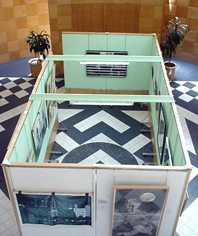 Aerial view of viewing booth featuring politically-themed work, including