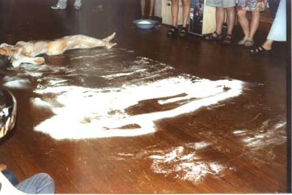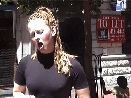 by Sue Williamson 'Life is Precious' arose out of a Cape Town experience of visiting Dutch artist Anet van de Elzen. Attempting to give three street children a little money each, she was shocked to be virtually knocked over by a mob of twice as many more, who seemed to appear from nowhere. A consideration of this event and the experience of coming from a first world to a third world country, grew into a performance piece with local artist Andrew Putter, which took place in St George's Mall in central Cape Town on Saturday morning. The two drew a chalk circle as a stage, and seated in the middle, Van de Elzen blindfolded herself in black, as Putter walked round the circle singing in a low voice and flinging coins onto the ground. Van de Elzen then uncovered her face, and in a powerful and lyrical voice addressed the gathered audience to sing a Bach composition which translates loosely as Are You By My Side? As with many performances, exact interpretations are elusive. The strength of the piece arose from the associations created by the actions of the performers, and the effect of Van de Elzens transformation from a partially bound and silenced figure to one reaching out to an audience through song.