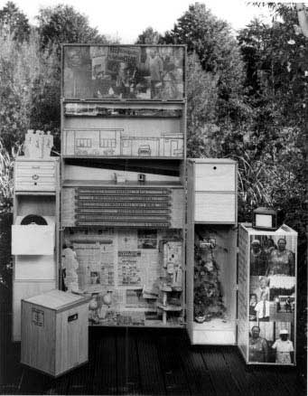 by Virginia MacKenny Dutch artist Annelieke Grob's Daily Life in a Suitcase, is not the sort of exhibition you should pop in to see if you only have a couple of minutes to spare. Ten years in the making and densely packed with visual, auditory and tactile stimuli it takes a while to orientate oneself in relation to the plethora of drawers, knobs and screens that present themselves for scrutiny. Telling the lives of six South African women, four black and two white, the project was initiated by sending a suitcase with a camera and instructions to various women who were prepared to participate. These disparate lives are brought into union through the structural device of the packing cases that are cleverly designed not only to carry the works, but also open like old-fashioned dressers to reveal their contents. Rarely has the feminist dictum �the personal is political� been so clearly elucidated. Generic categories such as "family"� "house"� "work"� and "garden"� allow the viewer to make comparative assessments between the lives of the woman. These comparisons reveal the larger context within which the women live. Jerry cans and paraffin stoves play off hairdryers and electric mixers. The minutiae of domesticity slowly and effectively builds up a very powerful sense of the differences that apartheid created. Narratives of privilege are played out against narratives of loss - Audrey Heyns� simple statement "I seldom swim. You know how it goes, when one has a pool one does not use it much"� becomes jarring when set against Kedibone Elisabeth Malulika's celebratory declaration at having running water in her new bathroom. This is given added poignancy when she remarks that they hope to add a geyser so they can have "hot water!" The cut-out figures atop the crates or the tableaus set up within them become equally telling in their simplicity. The miniature, pink, plastic suitcase packed with "daily sources of strength"� from the bible is integral to the life of a woman handicapped in childhood by the spillage of boiling water, the little flickering toy TV or the dolls china tea set talk of familiar daily rituals that structure the various women�s lives. Individual stories, told through mini projection boxes which viewers have to activate by hand, engage through their more open interpretation of events in the women's lives. The narratives, on the whole, though, seem to come across more powerfully in words than in the visual presentation. Whilst the panoramic shots around the women's homes are powerfully evocative the considerable quantity of snapshots presented produces a visual fatigue that leads to generalised looking. It is only the small typed headings that stop us and call one to scrutinize more closely. The simple one-liners where the women make statements of their own personal triumphs or insights into life or talk of their gardens; the need for a fence to keep goats out; the dream of fruit trees, seem to indicate that a book could as easily and effectively been constructed from these encounters.