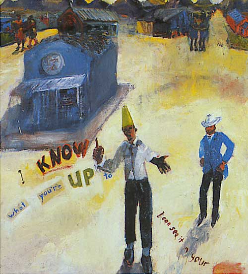 Elegant indeed are the small wall pieces by Lene Tempelhoff, up now at the AVA, immaculately fabricated from steel, red clay, bronze. and plastic. In matt, earthlike finishes of a rich brown, each seems to present the handsome fa�ade of sparsely decorated buildings of North African influence, with little possibility of ground level entry - though high windows and upper balconies provide lookout points, and small planes seem to have landed on many. 'Excursions and choicelessness' is the title of the exhibition. 'Excursions' seems clear enough - these are small journeys into the poetic. Choicelessness? Tempelhoff cites her influences as 'yoga, Eastern philosolphies, dancers, aeroplanes, stage sets, jetties', and also fires and palm trees, a fine range of choices. Some of the pieces have engraved script, and those pieces seem limited by the incised words. There are also a series of small table-top tableaux in painted jelutong, which, while attractive, do not engage the attention as the intriguing Flights of Consciousness series on the wall. In the Main Gallery, Canadian Howard Podeswa shows work with a refreshing lightness of touch. Podeswa paid two visits to South Africa, in 1998 and 1999, spending time out at Zweletemba township near Paarl, hanging out, becoming part of a Community Peace programme, listening to the things people say and noting their responses with his eyes. One gets the impression Podeswa fitted in rather easily. The work on show is entitled 'Spit of Love', and includes paintings and sketches, some pinned simply to the wall which are amalgams of his experiences here and of working in community projects in his hometown of Toronto. "I KNOW what you're UP to - I can see it in your eyes" is the record of a brief encounter with the trickster Timbele, clad in a green pointed hat. Behind this work, a sound installation by Jeremy de Tolly brings something of the street into the gallery. Other work by Podeswa, sometimes in comic strip format, presents moments of debate in community argument. With his fresh, brushy style, Podeswa gives a bright and quirky view of the townships as seen by an uitlander. Upstairs, on the ArtStrip, Timothy Zantsi presents his insider's view of township life, working in paint and pastel to present a series of moments from daily life. This is Zantsi's first solo exhibition, sponsored by the Outreach programme of the AVA. The work gives off a high degree of energy, but the paint surfaces of ten seem somewhat overworked, and Zantsi will have to watch that his work does not descend to the level of caricature. My own favourite was a piece which seem to have been added as an afterthought, pinned up just outside the entrance. Entitled 'Women Refugees', three women seated on a bench are described with free flowing brush strokes which almost suggest leaves blowing in the wind - an appropriate style for the subject. All shows close on March 25.