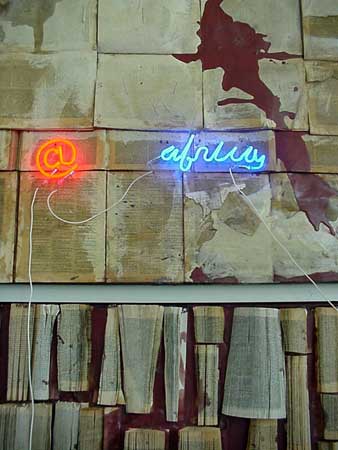 @Africa.com on the facing wall is by far the exhibition's major work - a huge surface covered in open books that form a kind of information landscape, on which neon text, African "artifacts" and other images are placed. A true "painting installation", as Barker describes this way of working, it's a handsome piece.