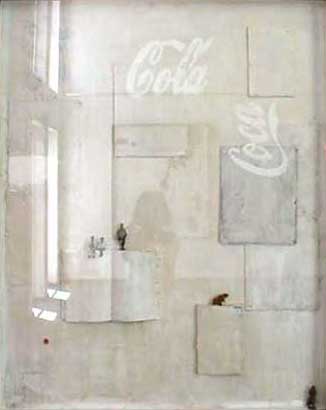 Smaller works focusing on individual brand names, each of which seems to have been ascribed its own colour, hang as a series on one wall. Again books form a shifting 2D-3D landscape, negotiated by small cast-metal figurines that Barker apparently salvaged from a mini-town-type amusement park. The "politeness" of the frames is at odds with the murky, messy application of the paint, which is probably the most "offensive" aspect of this show.