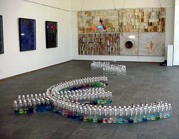 On the floor of the Alliance Française gallery, Wayne Barker has lined up empty All Gold tomato sauce bottles (with no labels but you recognise them immediately) to form the sign of the mighty dollar. The two vertical lines are peopled with small cast-metal figurines that one might describe as "cosmopolitan", being of mixed race in various postures and dress. Next to this, Barker has laid out the Euro icon in much the same way, but with coloured liquid partially filling each bottle.