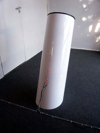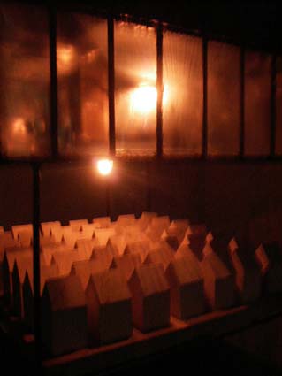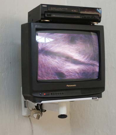 Clive Hardwick's Severance is a display of two light boxes of his scarred torso and three large digital prints of leaves, which start to read as fragile and bruised themselves, their veins seeming to take on the feeling of 'scar'. These images and ideas are invariably imposed on the indefinable animal part in Carol Gainer's video entitled Sleeping. The distorted breathing from this video in turn filters down to Andries Botha's work in the Multi-media room below. Shrouded in darkness, the rasping breath is mimicked by a flashing light and accompanying whirring sound. The rows of slightly lit uniform cement houses lying beneath an industrial structure set up an eerie atmosphere further perpetuated by the animal breath upstairs.