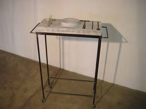 The former strategy is evident in Body Tools where a slab of marble on a steel trolley forms the apparatus for some unknown procedure. A bowl is hewn from the marble surface, pitted at the base, and to the right some ominous tools lie in their hollows. To the left, a bone rests in a sunken form. The words 'Body Tools' are engraved on the side of the marble slab.