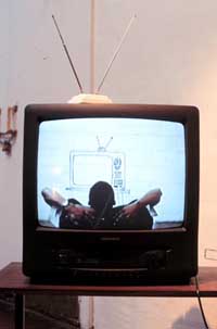 Unplugged is the work of a young black Johannesburg art student, Robin Rhode, and is currently part of 'Channel', the exhibition of video art at the AVA in Cape Town. In Unplugged, first shown at the Rembrandt van Rijn Gallery in Johannesburg last month on the exhibition of the same name, the artist is seen watching a TV - except the TV is his own drawing of a set - which he gets up to "tune in" and "adjust" from time to time. "The concept came about from the graffiti works I was doing around my neighbourhood," says Rhode. "I made a stencil of a TV and started spraying it on walls of train stations, shop corners, etc. I wanted the image to have an omnipresence. It speaks about people, especially young people not being able to draw a line between reality and fiction as they try to relive what they see on TV."